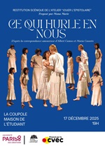 « Ce qui hurle en nous » interroge la parole amoureuse quand elle se démultiplie, appliquée à l’écriture épistolaire et dramatique. À partir des lettres de Camus et Casarès et du Chœur des amants, les étudiant·es de l’atelier Jouer l’épistolaire explorent ce que devient l’intime lorsqu’il passe par un groupe : une voix troublée, éclatée, superposée. Que reste-t-il de l’intime lorsque plusieurs voix disent le même mot ? Où commence le “nous” quand le “je” se brouille, se superpose, se perd ? Dans « Ce qui hurle en nous », choralité et polyphonie y révèlent la confusion des identités, le glissement du “je” au “nous”, les échos, les silences et les décalages qui habitent toute écriture d’amour. Le public est invité non pas à lire ces lettres, mais à les traverser : à entendre ce qui, en elles, murmure, se répète, se perd — et parfois hurle.