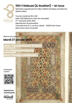 Le séminaire « 100+1 Deleuze (&Guattari) et nous » s’inscrit dans les recherches actuelles sur la philosophie de Deleuze (et de Deleuze et Guattari) au département de philosophie et au LLCP (le Laboratoire sur les Logiques Contemporaines de la Philosophie EA 4008). Il prend pour occasion la commémoration du centenaire de la naissance de Gilles Deleuze en 2025 (100 + 1) pour discuter les recherches en cours, de manière transdisciplinaire.