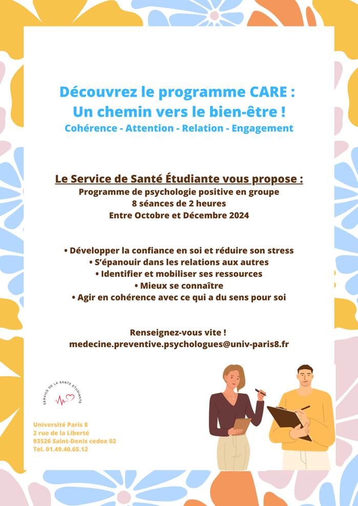 Vous souhaitez prendre soin de vous et de votre santé mentale, vous pouvez participer à des groupes de psychologie positive animés par les psychologues du Service de Santé Étudiante.