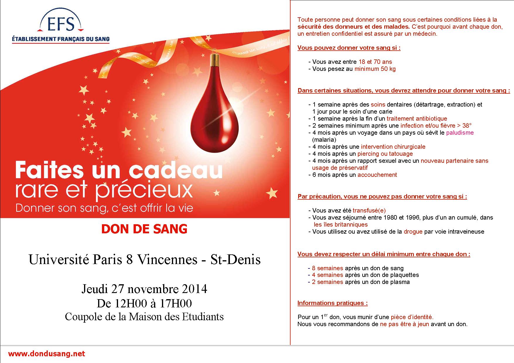 Un don du sang est organisé à l’Université le jeudi 27 novembre 2014 de 12h à 17h à la maison de l’étudiant (salle de la coupole).