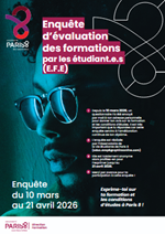 A partir du 10 mars et jusqu’au 26 avril, vous povuez répondre à l’enquête d’évaluation des formations (EFE), qui vous donne l’opportunité de s’exprimer sur les points positifs et négatifs rencontrés pendant votre année de formation. Chaque étudiant recevra sur sa messagerie universitaire une invitation à répondre à l’enquête. Les invitations sont envoyées chaque mardi, pendant la durée de l’enquête. Les réponses à cette enquête constituent des retours précieux pour l’amélioration continue de nos formations.