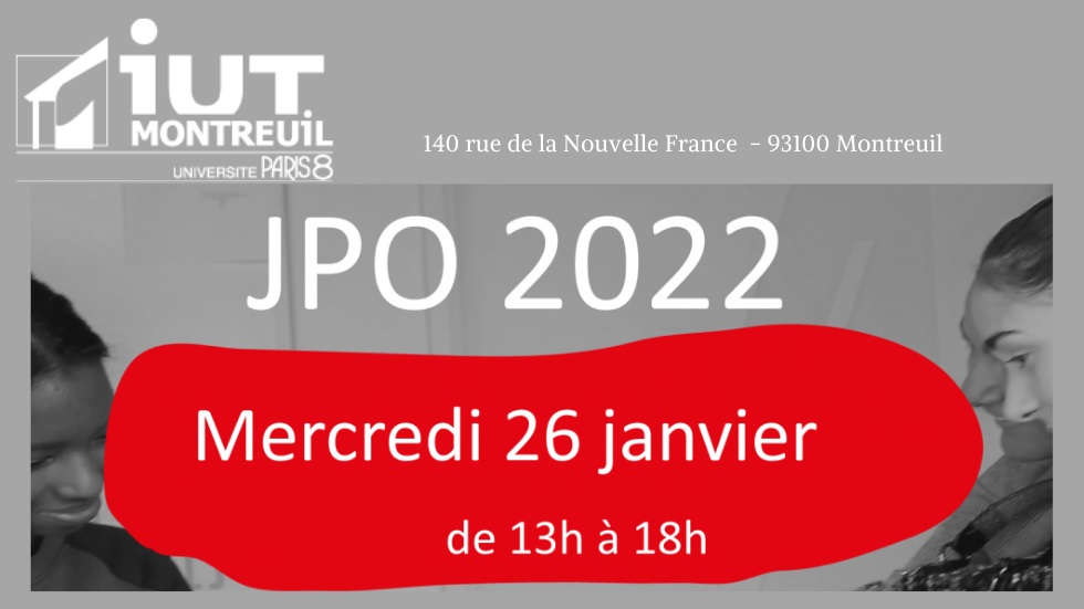 L’IUT de Montreuil organise sa Journée Portes Ouvertes mercredi 26 janvier de 13h à 18h. C’est l’occasion de visiter nos locaux et de rencontrer les enseignants et les étudiants.