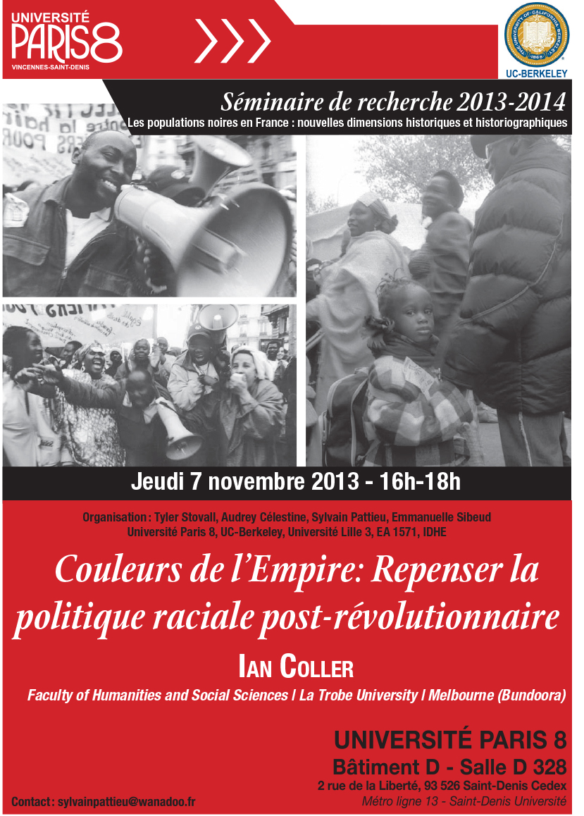 historiographiques » avec Ian Coller (La Trobe University, Melbourne), auteur de Arab France : Islam and the Making of Modern Europe 1798-1831 (Berkeley : University of California Press, 2010) pour une intervention intitulée : « Couleurs de l’Empire : Repenser la politique raciale post-révolutionnaire »
