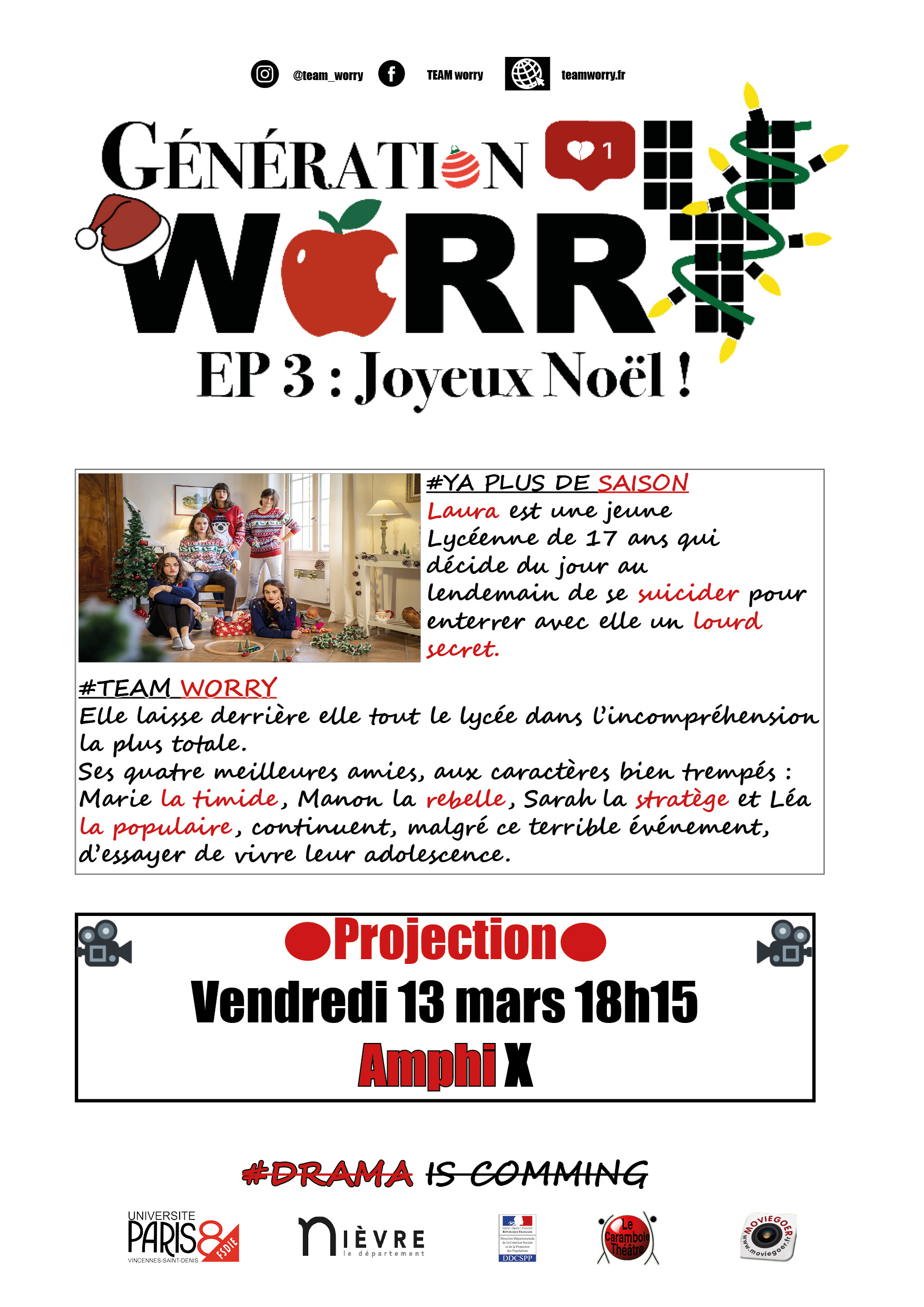 Aujourd’hui, la #TEAMWORRY arrive à l’université Paris 8 pour projeter le troisème épisode de sa web série. Le noyau de départ s’est élargi en créant une association. Tous les membres sont réunis dans une volonté de découvrir de nouveaux horizons cinématographiques. Expérimenter pour apprendre, ne serait-ce pas la définition même de l’adolescence ?